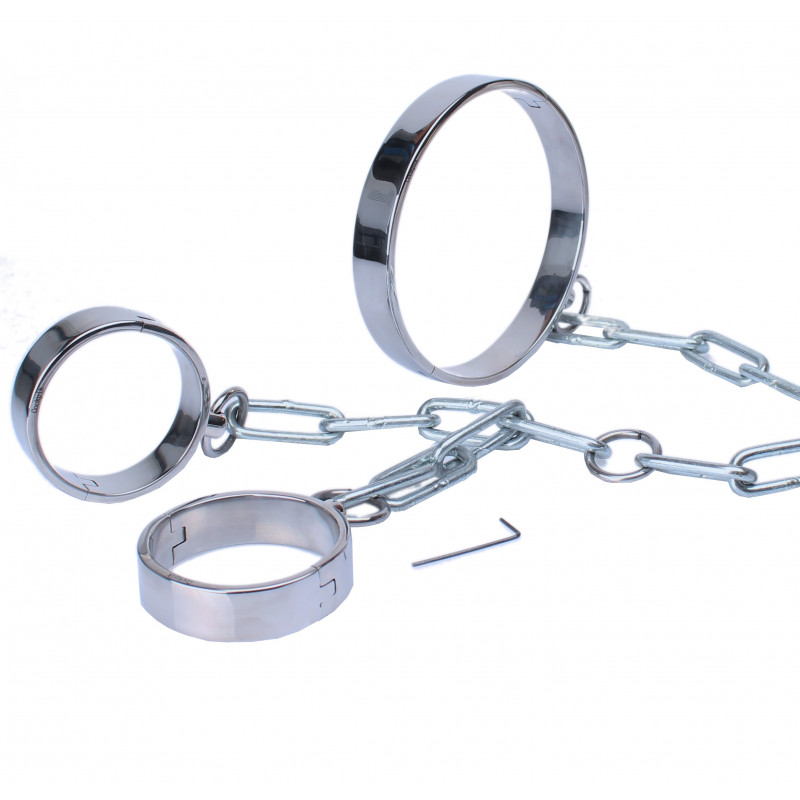 Diese Hand- und Halsfesseln von Cockpick aus Edelstahl sind durch eine stabile Kette verbunden. Das schlichte Design lässt Raum für deine eigenen kinky Fantasien. An den Kettenglieder lässt sich beispielsweise eine Leine einhängen, damit du die gefesselte Person herumführen kannst.
